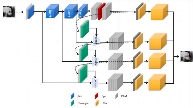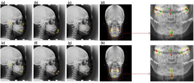 在头影测量分析中,头部标志的识别对正畸和正颌手术中颌面组织的解剖定位有重要贡献。然而,现有的方法存在精度低、识别过程繁琐的限制。在此基础上,论文提出了一种多尺度YOLOV3(MS-YOLOV3)算法,用于检测头部测量标志。经验证,相较于传统的YOLOV3方法,该方法具有较好的鲁棒性,侧位2 mm内检出率为80.84%,3 mm内为93.75%,4 mm内检出率为98.14%,前后位2 mm内检出率为85.75%,3 mm内检出率为92.87%,3mm,4mm内检出率为96.66%。结果表明,该模型可用于侧位和前后位的标记,可用于临床正畸和正颌手术。